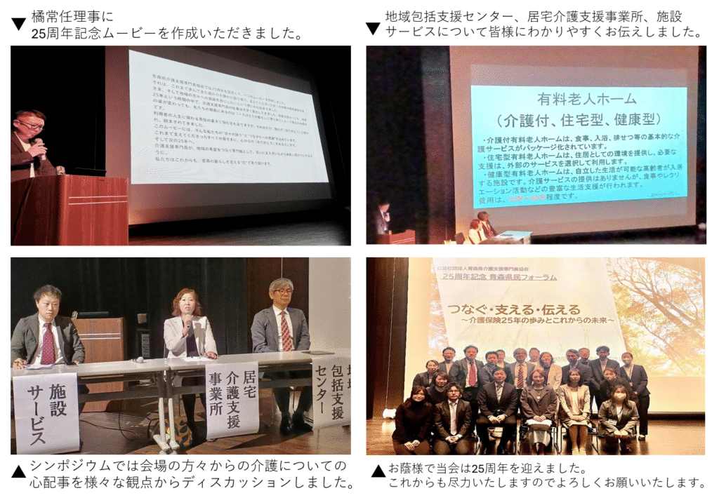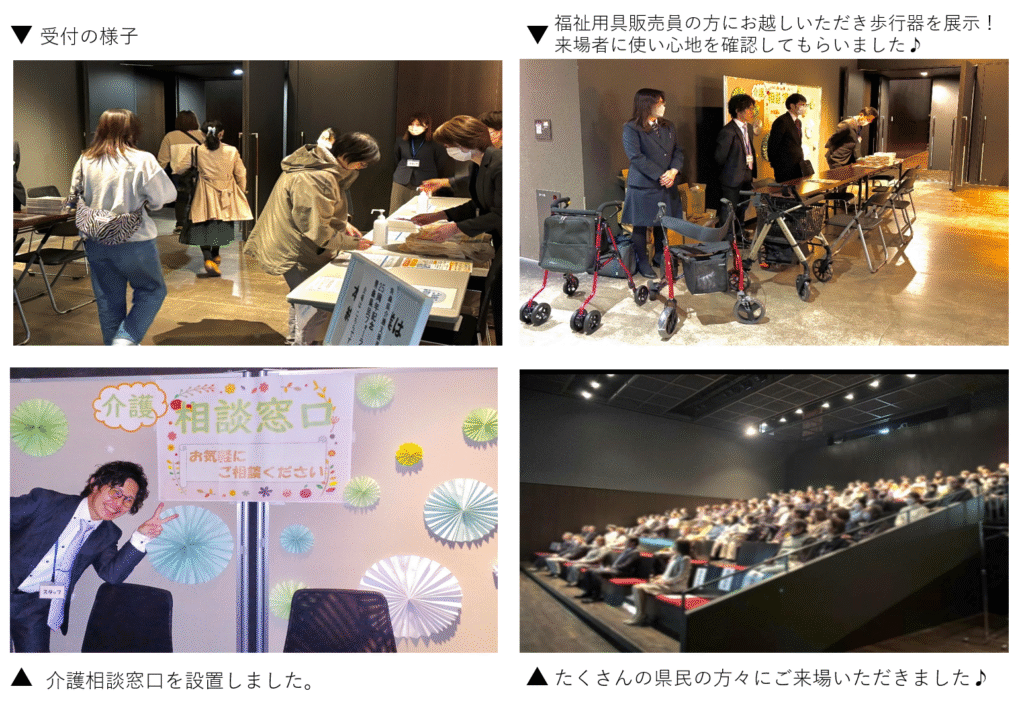 シンポジウムでは「つなぐ・支える・伝える」のテーマのもと、地域包括支援センター、居宅介護支援事業所、施設サービスの役割を皆様に伝えることができ、県民の皆様と介護や福祉について共に考える機会となりました。